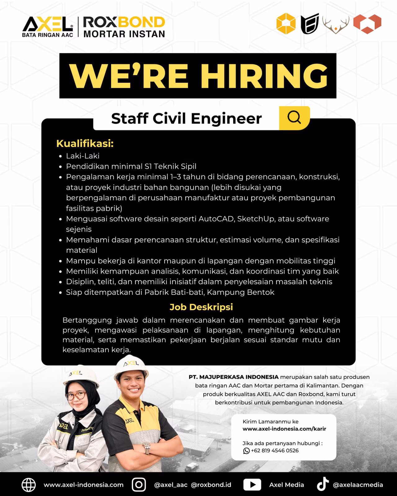 - Pengalaman kerja minimal 1–3 tahun di bidang perencanaan, konstruksi, atau proyek industri bahan bangunan (lebih diutamakan yang berpengalaman di perusahaan manufaktur atau proyek pembangunan fasilitas pabrik)